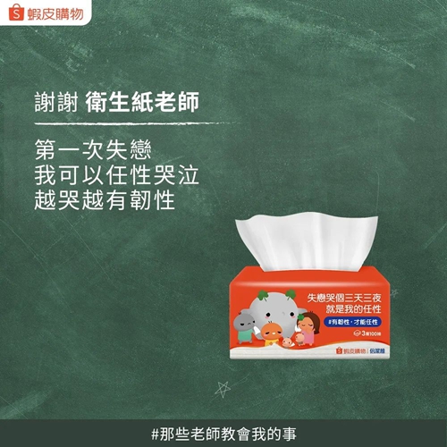 以重新解读文字的方式,拆穿渣男语录背后的“深意”,提醒人们别被渣男哄骗,谨防上当。教师节,虾皮购物以向老师感谢的语气,对产品写了一组感谢信,感谢这些物品们。