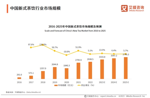 数据显示,2023年中国新式茶饮市场规模将达3333.8亿元。随着新式茶饮消费场景更加多元化,品类不断创新拓宽,消费者对新式茶饮的热情持续上升,预计2025年中国新式茶饮市场规模达到3749.3亿元。这些数据表明中国新式茶饮市场有着广阔的增长前景和巨大的发展潜力。