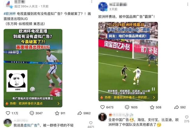 在这场预计超过20亿次国内观看人数的2024届欧洲杯,已涌现出许多精彩瞬间,包括东道主首战胜利、知名球队落败和个人球星实力封神等等。但与此同时,中国球迷在享受这场欧洲足球盛宴的同时,也惊喜地发现赛场边出现了许多中国品牌的广告,这些广告让“中文刷屏欧洲杯”一度成为热搜话题。不仅如此,线上观看欧洲杯的观众更是发现了球场广告的“端倪”和破绽,这正是这次要讲的话题:虚拟广告技术“以假乱真”地为品牌带来新营销姿势。