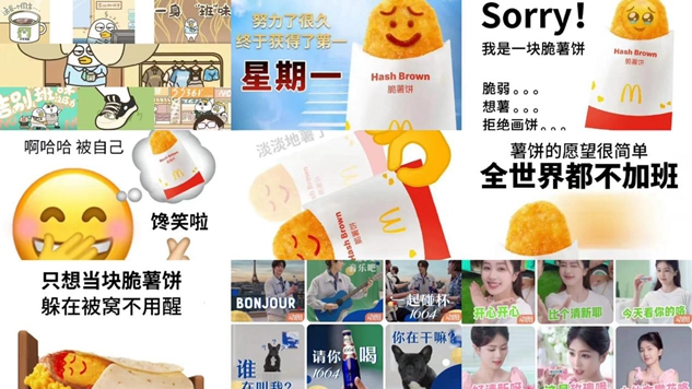 近期某运动品牌联合具有搞怪、职场刺头形象的小刘鸭表情表达了运动解除班味的价值观。这些表情通过幽默和贴近日常生活的方式,表达了年轻“打工人”的情感共鸣;也有麦当劳的原创薯饼表情包,用薯条薯饼等制成表情表达打工人心声;也有绿箭的花样清新真人表情清新职场以及1664的明星幕后花絮表情等等,可爱清新或者隐含寓意的表情包,无不显示出品牌们正在积极探索表情包营销的多样性和深度。