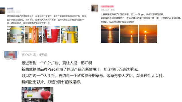 无论是通过公共空间创设、悬念的创造,还是自然景观的巧妙利用,这些广告都成功地将品牌与消费者的日常经验连接起来,增加了品牌的可见性和亲和力。这种创意的应用不仅让广告本身成为一种视觉享受,也让品牌信息在受众心中留下深刻而持久的印象,实现了广告效果的最大化。