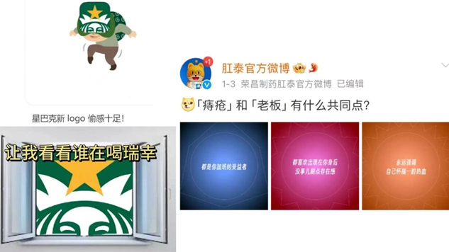 而“发疯”营销,则是指品牌为了吸引眼球,采取一些大胆、甚至是极端的营销策略,这种策略往往能在短时间内引发广泛的讨论和关注。举个栗子的话,像肛泰这样的大胆类比式文案(将老板与痔疮类比)“加班受益者、没事刷存在感、一腔热血、独立办公室、在意你上厕所时长、教你做人”;也有像星巴克调皮修改的品牌LOGO,用一个具有“偷感”的形象突出品牌“看谁在悄悄喝瑞幸”的既视感。