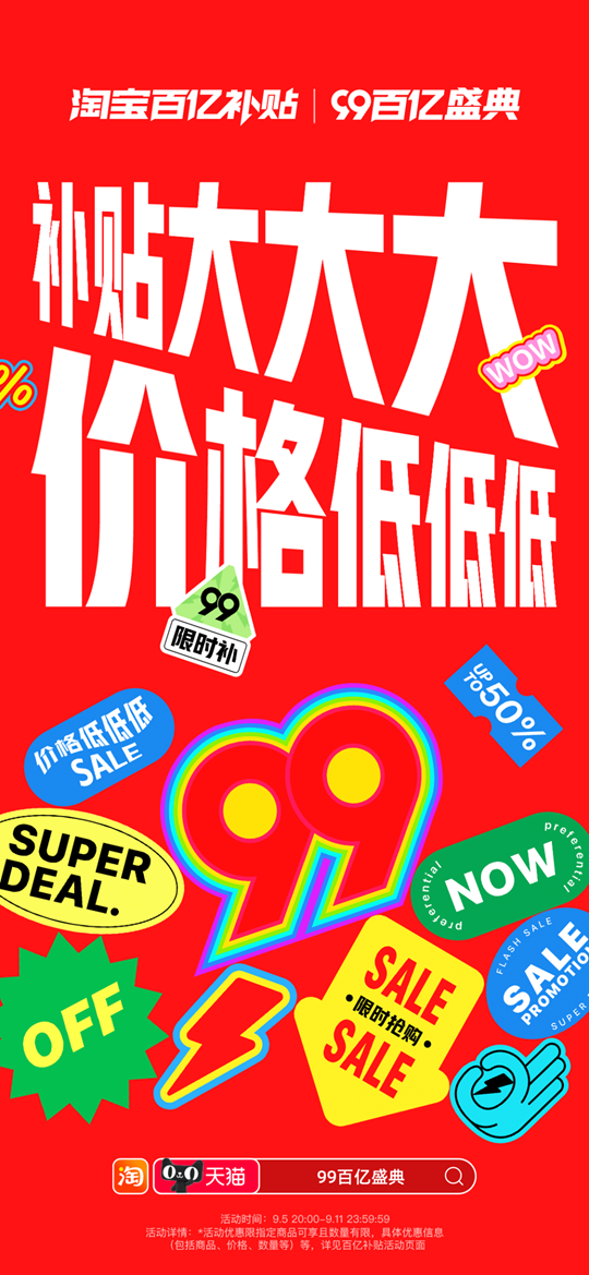 与此同时,无论是线上还是线下,都能看到淘宝百亿补贴通过大众化的传播手段,强化了 99 百亿盛典「补贴大大大,价格低低低」这一传播主题。
