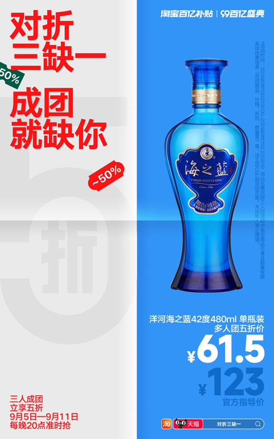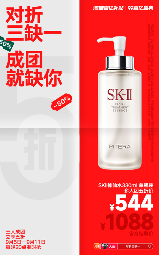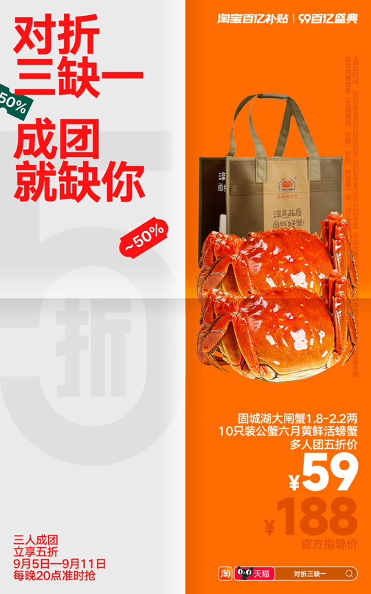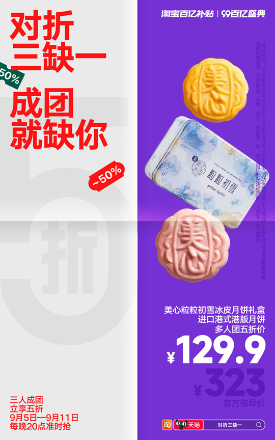 还有在这次 99 百亿盛典中,淘宝百亿补贴多人团强化「三人成团,立享5折」的玩法力度,推出对折三缺一的创意系列,让 99 百亿盛典多人团有了更趣味生动的表达。