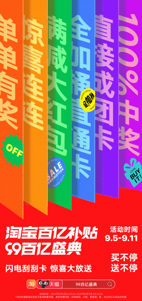 在这个过程中,它不仅活用了大字报的沟通方式,还提炼出了各式各样的促销元素,将它们转化为一个个视觉符号来渲染大促的氛围感。